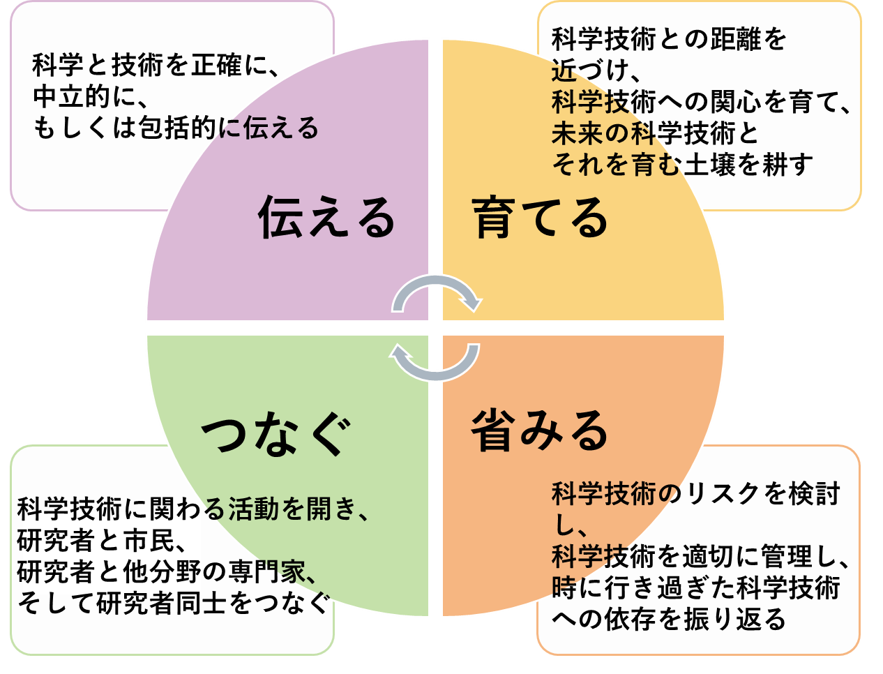 科学技術コミュニケーション自体を反省的で成長的なものにしていくために、自分たちも変わっていくことをこの部分に込めました。以前の文章ではその意図が伝わらないという指摘があったため、より背景の意図が伝わるように修正しました。