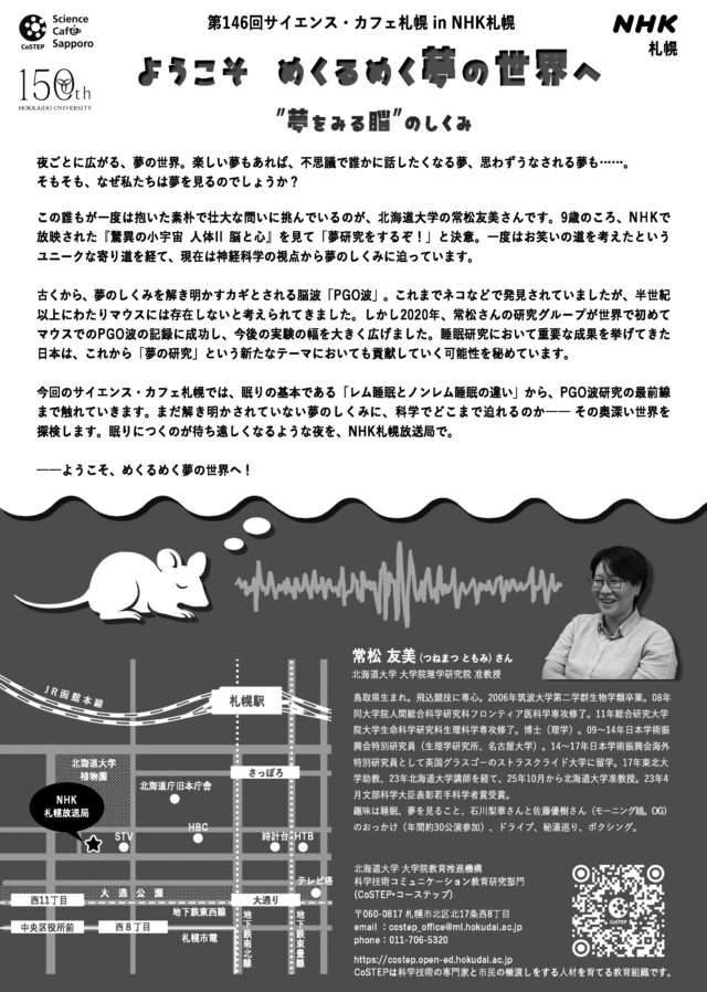 今回のサイエンス・カフェ札幌では、眠りの基本である「レム睡眠とノンレム睡眠の違い」から、PGO波研究の最前線までをご紹介。まだ解き明かされていない夢の謎に、科学でどこまで迫れるのか――その奥深い世界を探検します。眠りにつくのが待ち遠しくなるような夜を、NHK札幌放送局で。