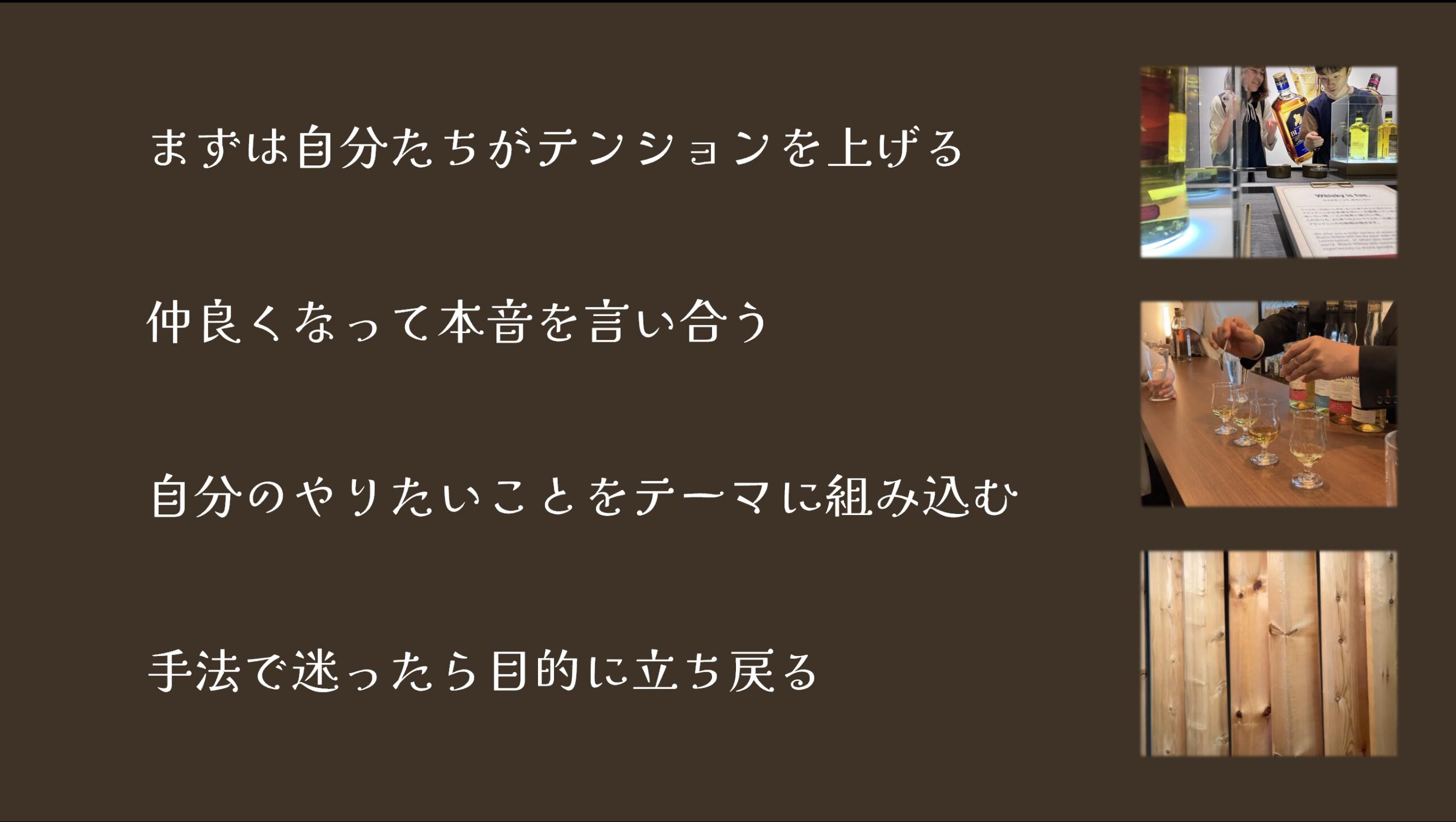 当日は、その4種のウイスキーを43人分、できるだけ新鮮な状態で提供する必要がありました。ウイスキーは注いでからすぐに飲まないと、味や香りが変化してしまうのです。そのため、ウイスキーの準備はカフェ開始とともに行われました。このホスピタリティを実現するために、対話班の別グループや他実習のメンバーまで、全面協力をいただきました。本当にありがとうございました・・・!