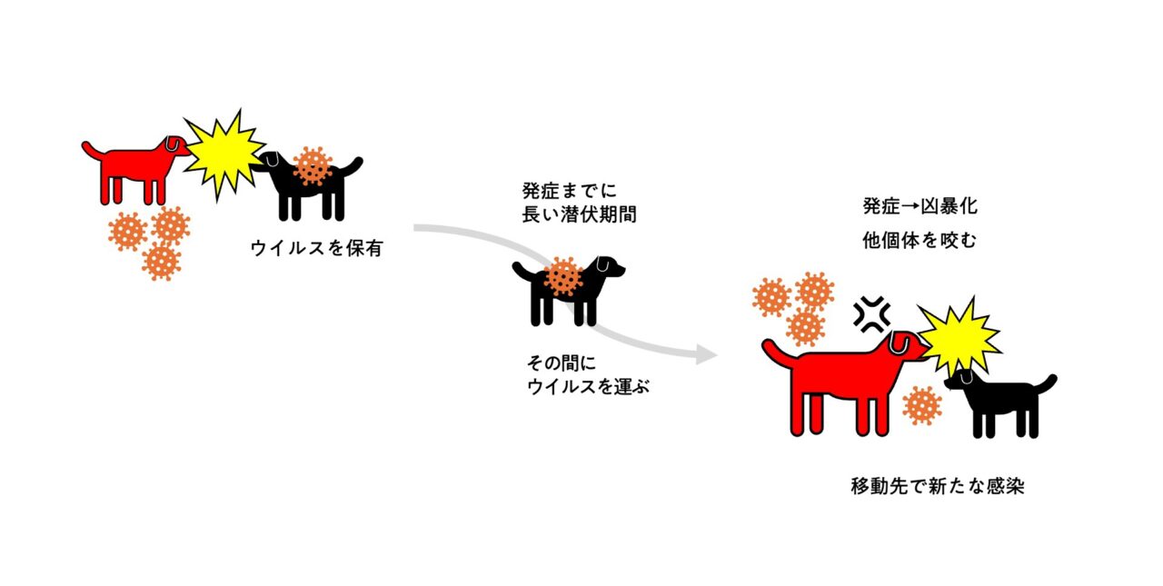 さらに、狂犬病は感染から発症までの潜伏期間が長く(通常は1〜3ヶ月だが1年以上かかる場合も)、感染した動物がその間に広範囲に移動し、そこで新たな感染を引き起こします。通常、致死性の高い感染症はすぐに感染した動物を殺してしまうためあまり拡大できないものですが、狂犬病はこの長い潜伏期間によって広範囲に分布域を拡大することができるのです。