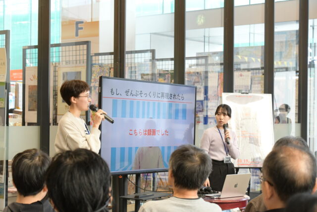 宮原さんのレクチャーに続く「もしもトーク」では、このサイエンスカフェの企画メンバーである大島さん、北川さんとともに、デジタル複製で人物を再現するとはどういうことか、イメージを膨らませました。トーク中の実演では、大島さんの音声データを学習したAIにより声が再現されたり、写真を学習したAIによって見た目が再現されたりと、だんだん本人が再現されていきました。最後には、大島さんが自身の録画映像と会話するという演出で、「もしも本人そっくりのデジタル複製ができたら?」という世界を疑似体験しました。