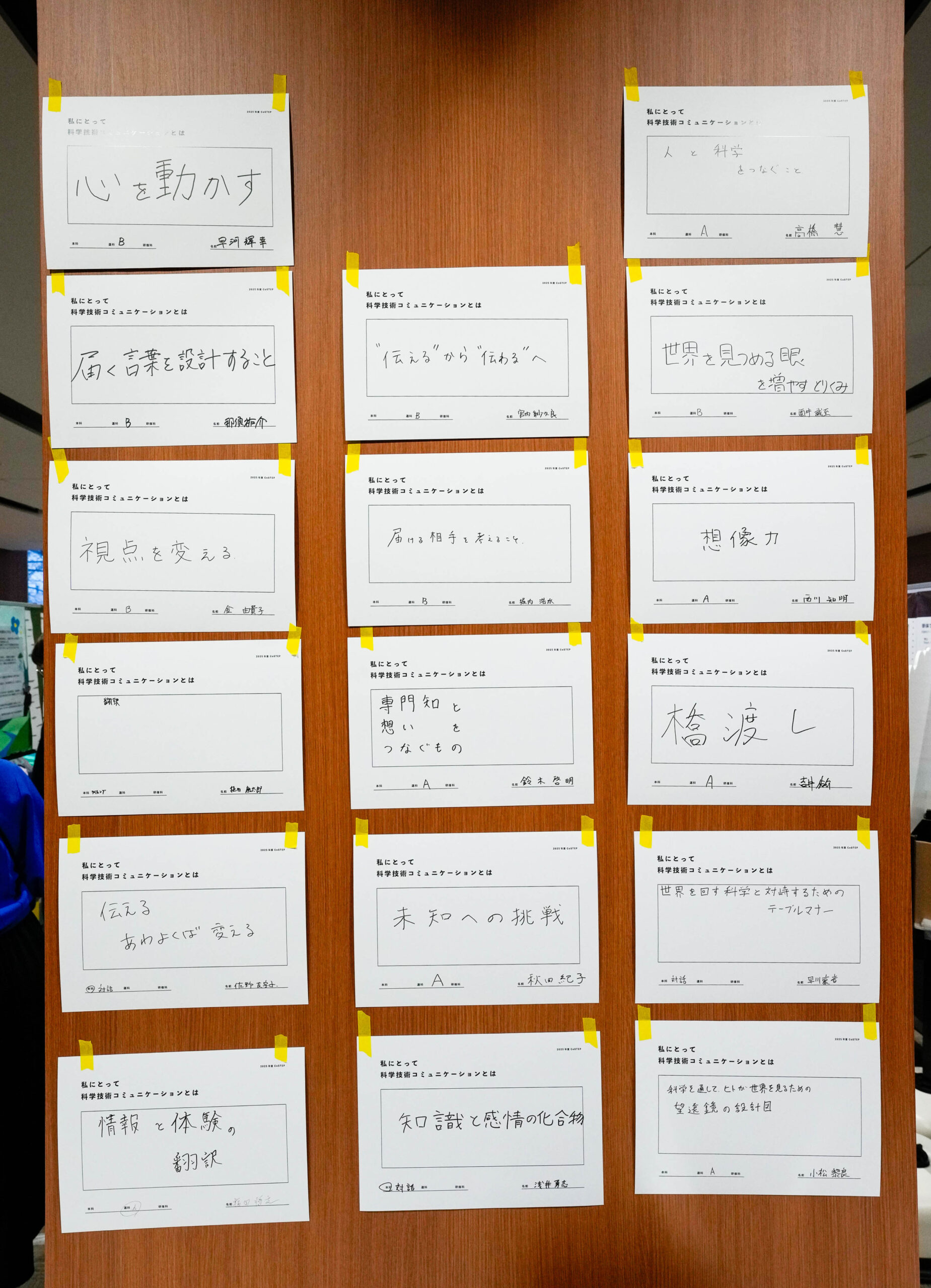 概要文:ポスター発表では、選科C各自の制作物(Before/After)とともに、制作過程で生じた違和感や納得しきれなさを言葉とともに可視化する。完成度の高い成果だけでなく、迷い、削ぎ落とし、悩み続けたプロセスそのものを展示することで、科学技術コミュニケーションにおける「分かりやすさ」と「伝わること」の間にある問いを来場者と共有する。あわせて来場者に実際に参加してもらう体験型の要素を取り入れることで、「伝える/伝わる」を自分ごととして考える場をつくる。