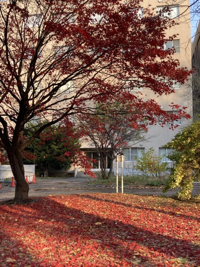 明け方から降り続いた雪が薄く積もり、散りゆく紅葉とコラボレーションしています。