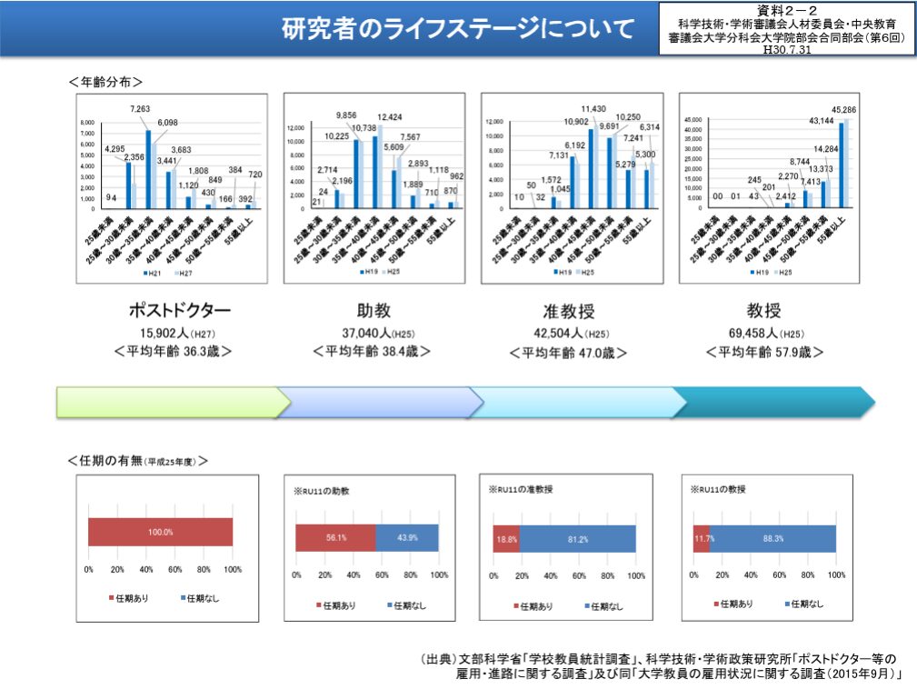 〈転載:文部科学省(2018年)科学技術・学術審議会人材委員会・中央教育審議会大学分科会大学院部会合同部会(第6回) 配付資料「研究者のライフステージについて」https://www.mext.go.jp/b_menu/shingi/gijyutu/gijyutu10/002/shiryo/__icsFiles/afieldfile/2018/08/13/1408158_3_1.pdf〉