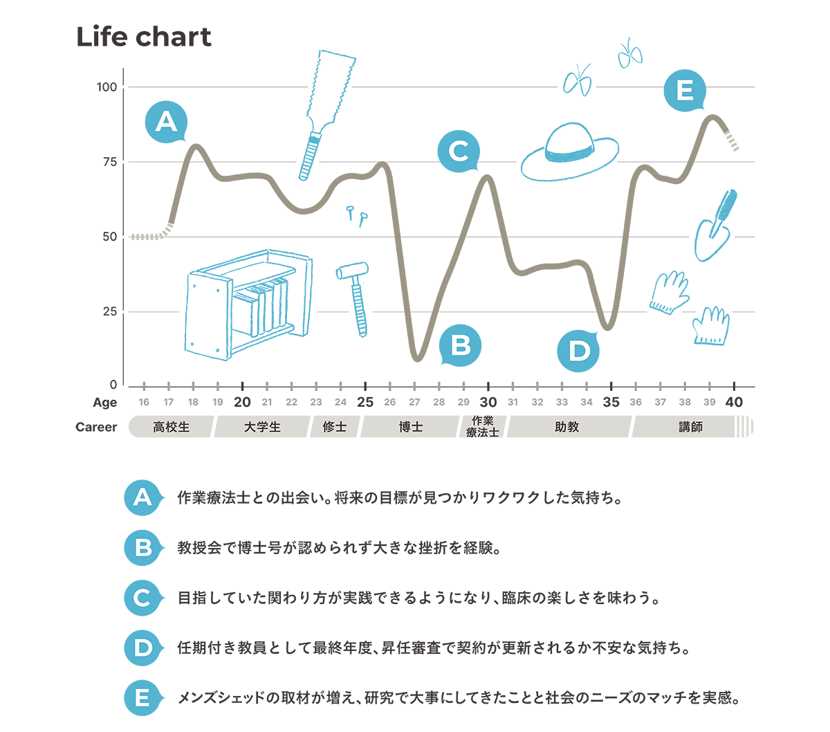 髙島さんは、作業療法士として臨床現場に携わった後、研究の道に進みました。患者一人ひとりの人生に寄り添いながら「作業」を通じて生活を支える作業療法の魅力を、臨床と研究を行き来しながら探究しています。博士課程では質的研究が十分に理解されず、大きな挫折を経験しましたが、「質的研究の意義を社会に伝えたい」という強い思いを原動力として、現在は教育や研究を通じて、次世代に作業療法の可能性と質的研究の価値を広めています。