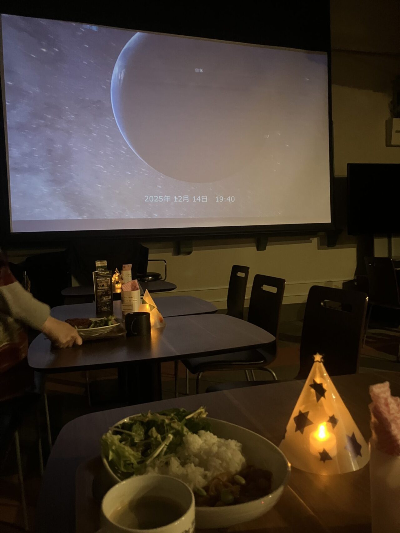 2025年12月14日、北海道大学総合博物館に併設されたミュージアムカフェぽらすでは、「宙カフェ」と題して、この日限定で一部のスペースを暗転し、博物館4Dシアターボランティアの方々によるプラネタリウムが上映されました。