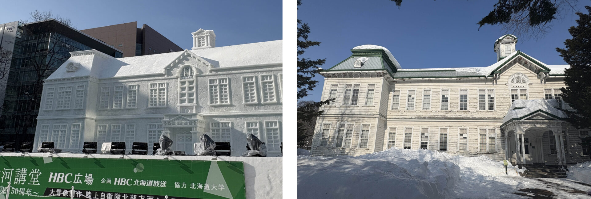 北海道大学の成り立ちには、1906年に古河家が社会貢献の一環として施設や設備を寄付したことが大きく関わっています。この支援によって教育環境が整い、札幌農学校は大学へと発展しました。その際に建てられ、現在まで残っているのが「北海道大学古河講堂」です。今回の大雪像では、マンサード(腰折れ)屋根やドーマー窓(小屋根付き窓)、入口のポーチなど、建物の特徴が細部まで丁寧に再現されていました。