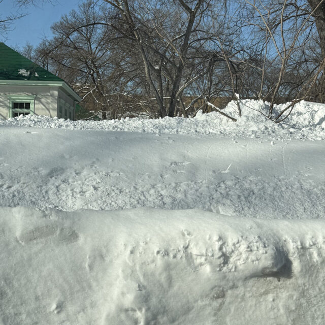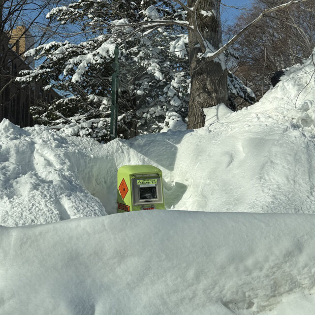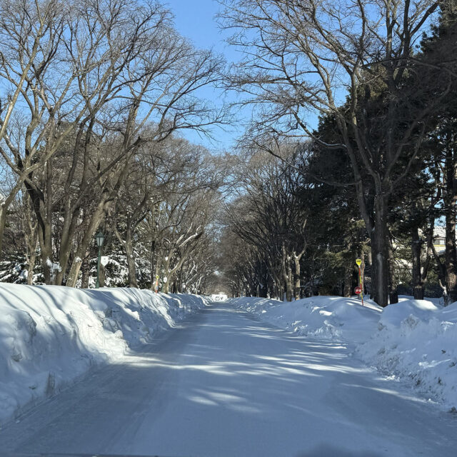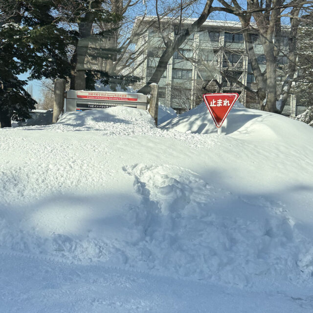吹雪の後に 昨日の吹雪が明けて、今日は晴れの札幌キャンパス。清々しい青空と、もりもり積もっている雪景色に目線が留まります。ツルツルの道、埋もれてしまった看板、木の影が描くメインストリートの模様まで… 2月ならではの風景をつくりあげています。