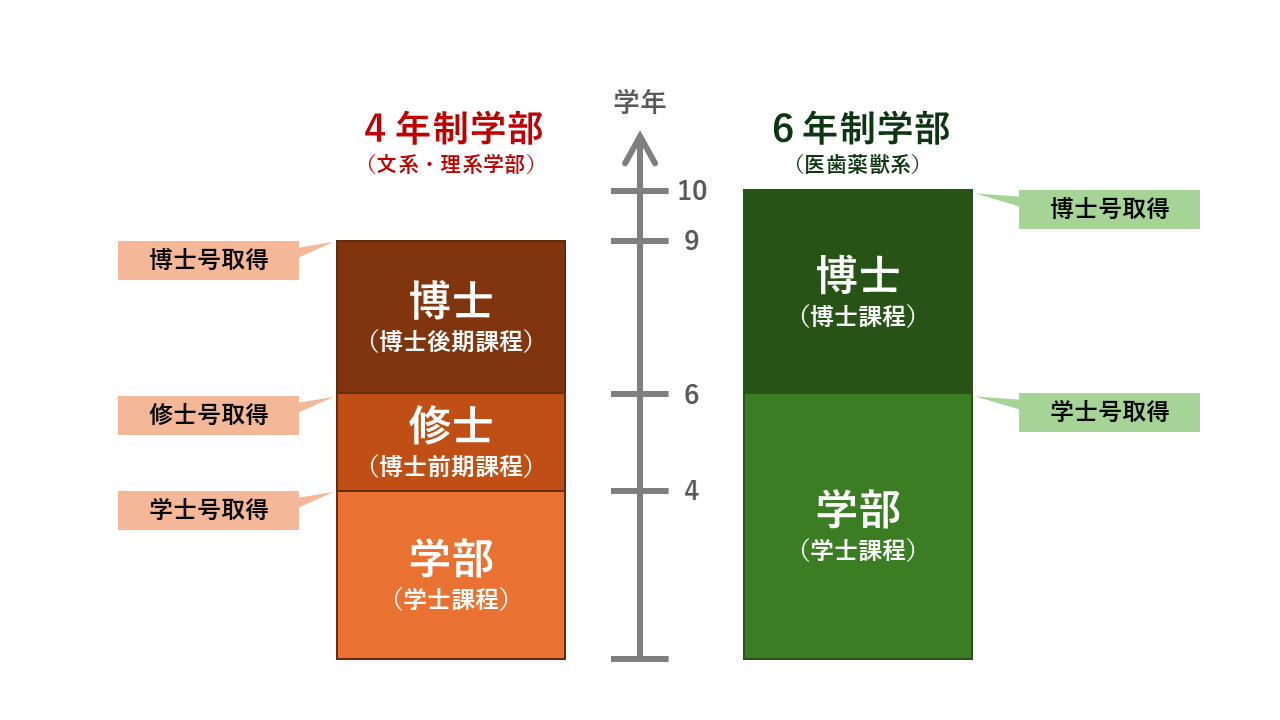 日本の多くの大学院では、まず修士課程が2年あり、その後に博士課程が3年あります(医歯薬獣系の学部・学科では制度が異なります)。学士・修士・博士はそれぞれ英語でBachelor・Master・Doctorなので、学部1年はB1、修士2年はM2、博士3年はD3、のように呼んだりもします。