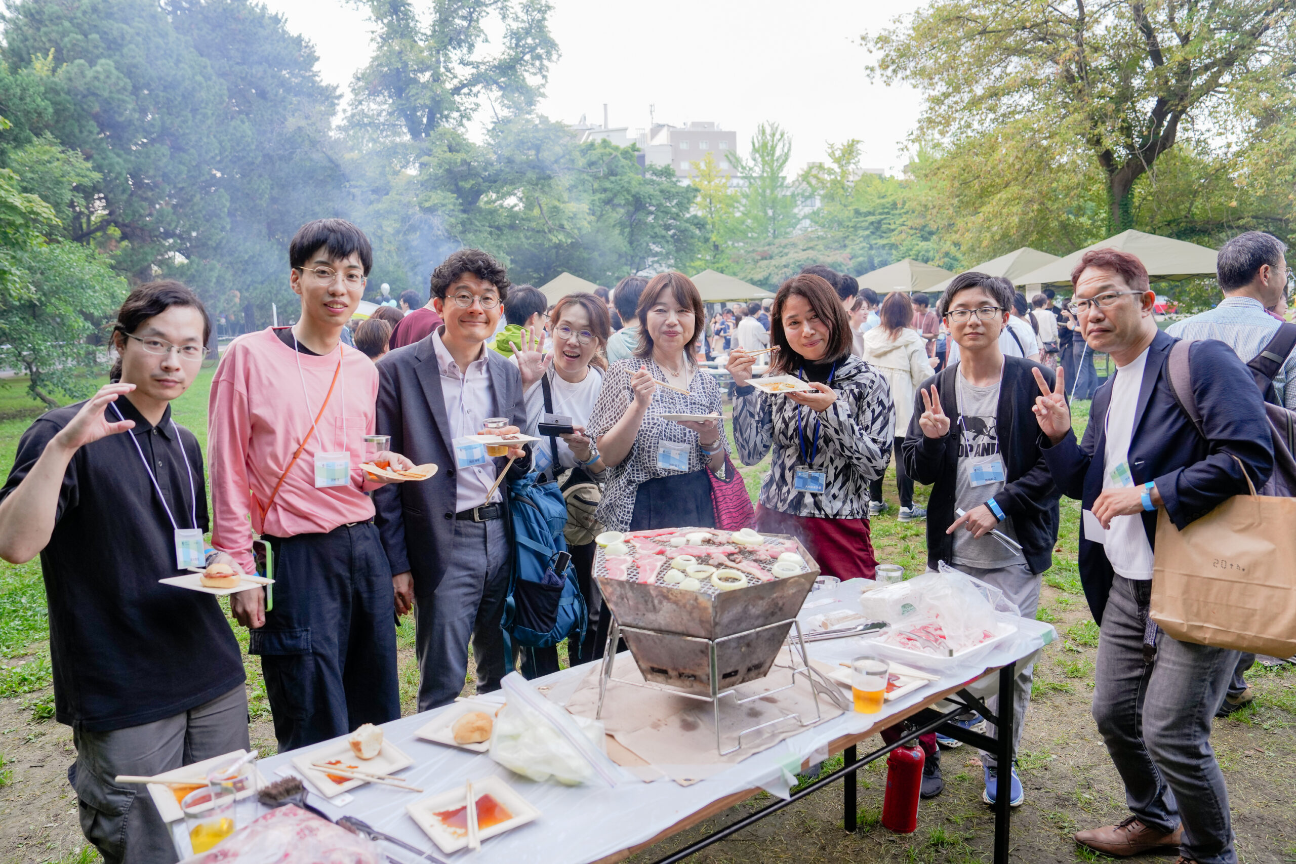 1日目の最後には、北大食材をふんだんに使ったBBQ懇親会が開催されました。北大短角牛やザリガニを使ったパエリアなどが提供され、にぎやかな交流の場となりました。