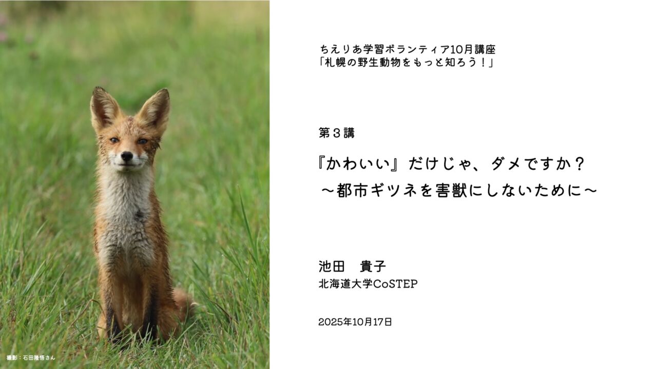 実践+発信 さっぽろ市民カレッジに登壇 2025.10.20 2025年10月17日、さっぽろ市民カレッジ2025秋期 ちえりあ学習ボランティア企画講座「札幌の野生動物をもっと知ろう!~共存・共生をするためには~」に、CoSTEPの池田貴子が登壇しました。本講座は、シカ・カラス・キツネ・クマをそれぞれ取り上げる全4講からなるオムニバス講座で、30名程度が受講しました。 (さっぽろ市民カレッジ2025 募集ちらし)