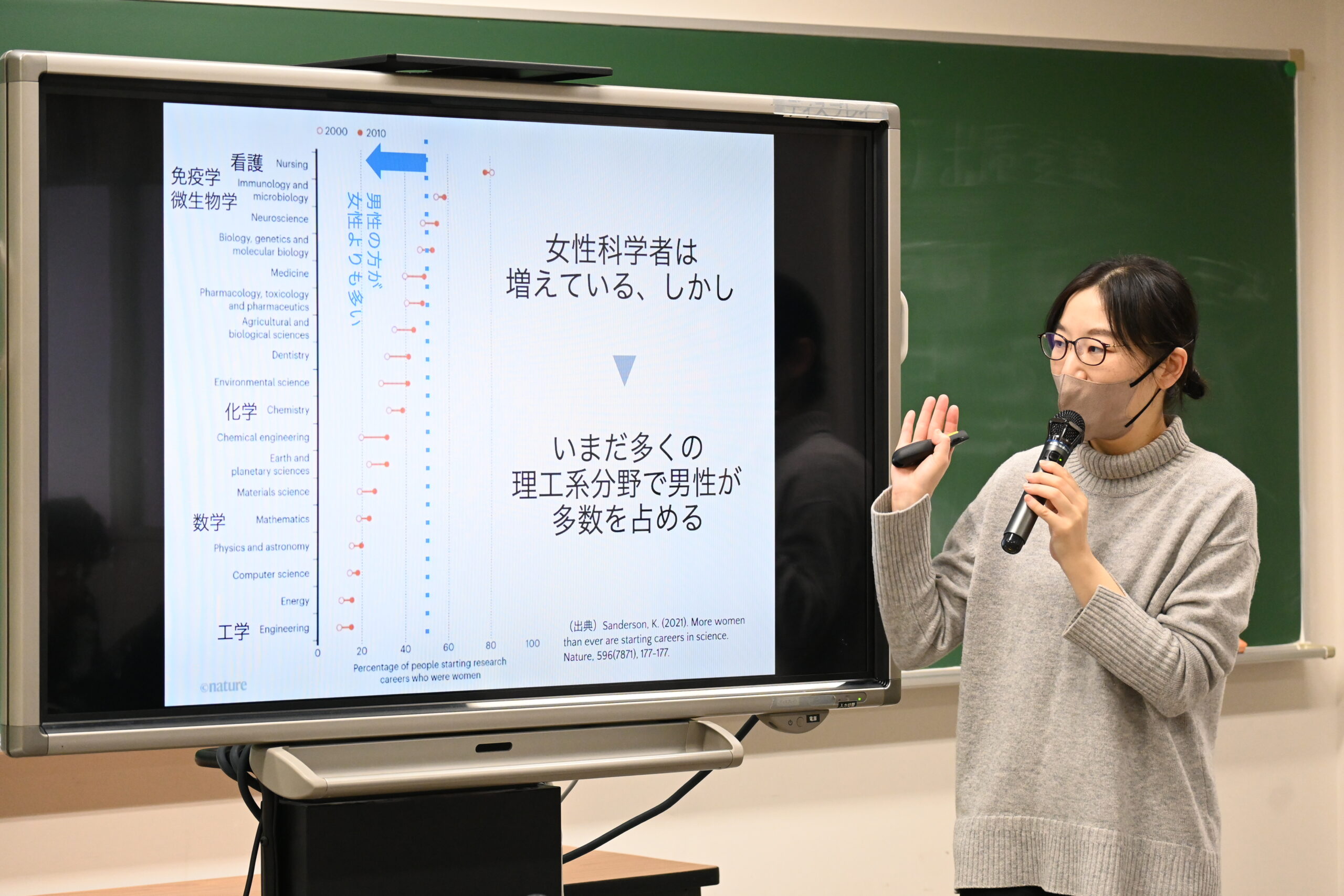 世界的に見ると、科学者を目指す女性は着実に増加しています。「科学者のイメージを絵で描く」というアメリカの調査では、女子生徒が女性科学者を描く割合が1960年代の1%から2016年には34%にまで上昇しました。アメリカでは、その要因として、理系分野特有の男性的カルチャー、幼少期の経験不足、自己効力感の欠如の3点が指摘されています。また、母親のバイアスが、子どもの性別によって進路選択に大きく影響するという研究結果も紹介されました。