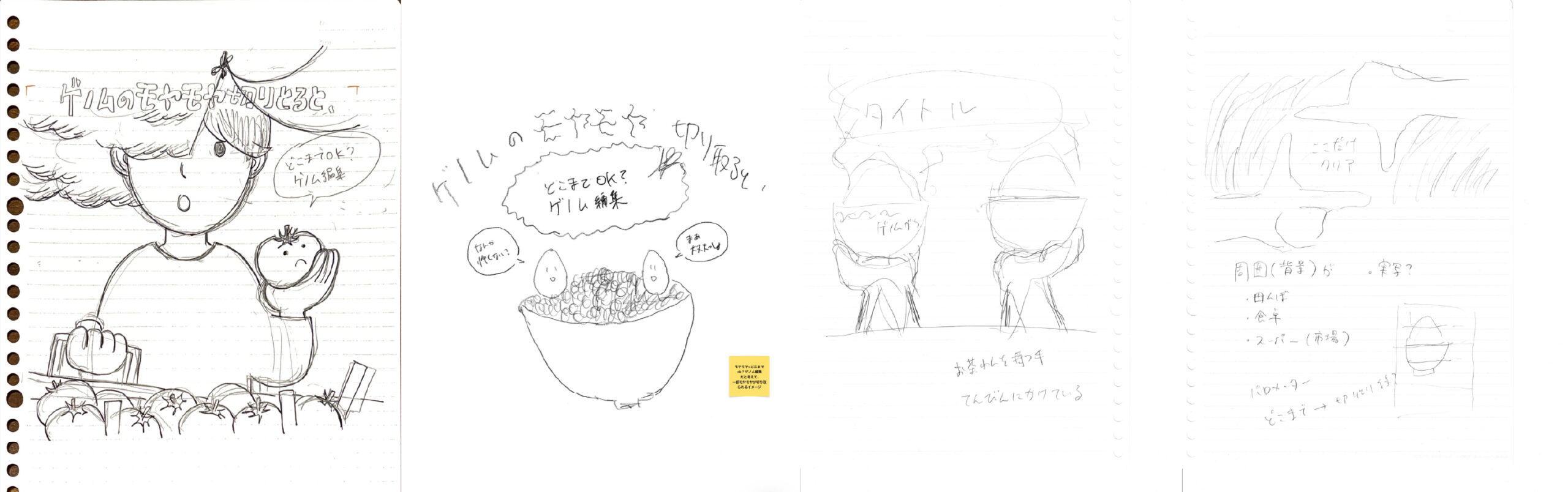 背景色の他にもタイトルの配置を縦書きにするか、横書きにするかについては考える余地がありました。縦書きにすることで、「、」の余韻を生かした配置にできそうです。それ以外にも日付を海苔で表現することを考えてみたり、箸でつままれた米キャラを追加してみたりとさまざまなデザインのブラッシュアップ案が生まれ、よりよいものになっていきました。